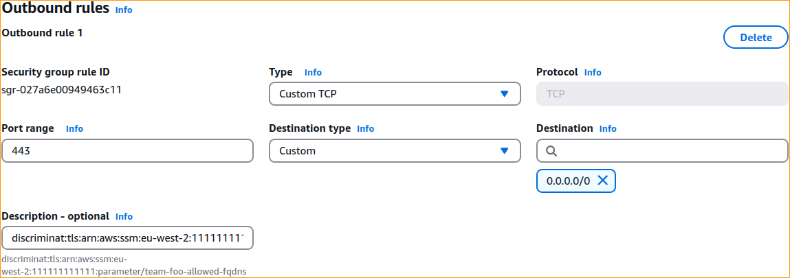 If the above payload were to be stored in an SSM Parameter called team-foo-allowed-fqdns, its full ARN could be arn:aws:ssm:eu-west-2:111111111111:parameter/team-foo-allowed-fqdns. Therefore, what goes in description field will be: