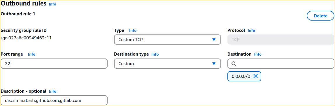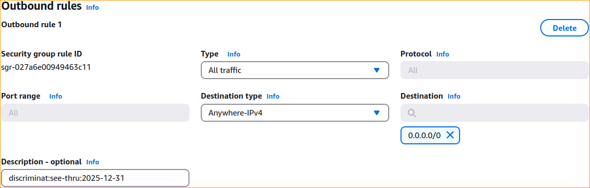 9092. Destinationmust be set to the narrowest IP block you can think of. Now if you don't have anything narrower than0.0.0.0/0that is absolutely fine! The firewall takes care of validating the destination IP address of actual packets in many ways, but the outbound rule at the AWS networking and security level must allow the packet to leave the protected workload at all.0.0.0.0/0is a safe choice with the DiscrimiNAT Firewall in the way.- Should you wish to use the same port number again with a different Rule, set the destination to