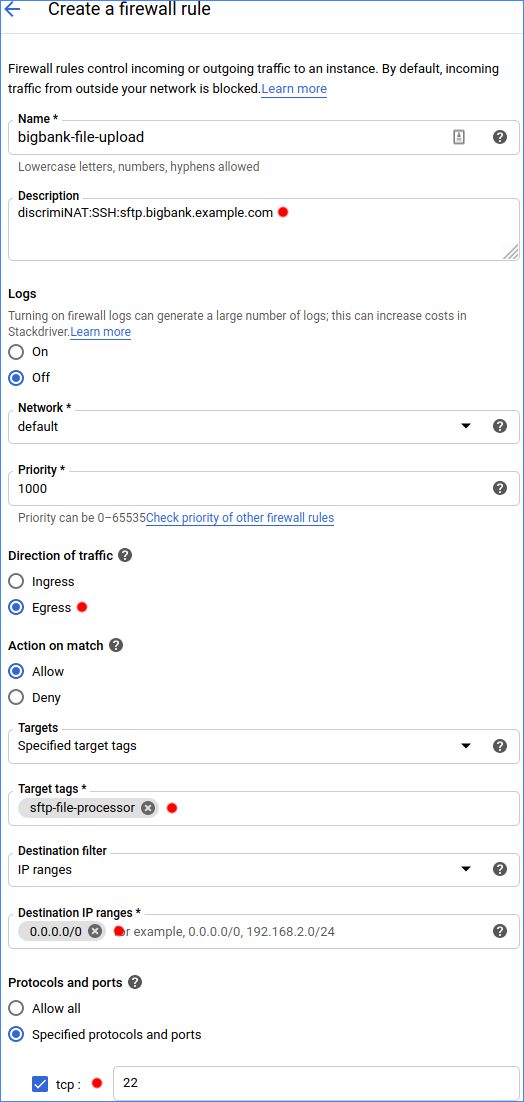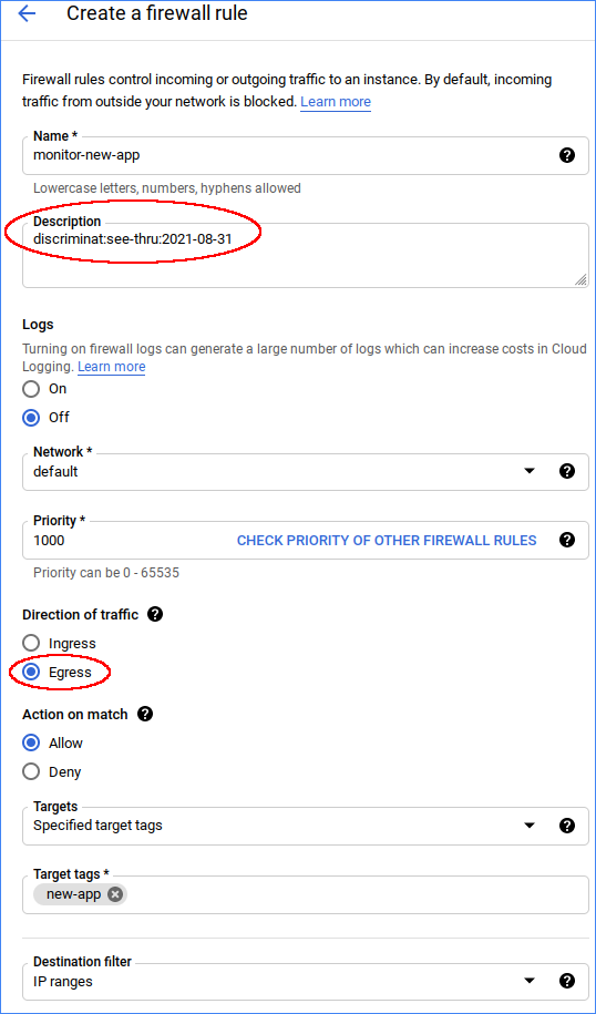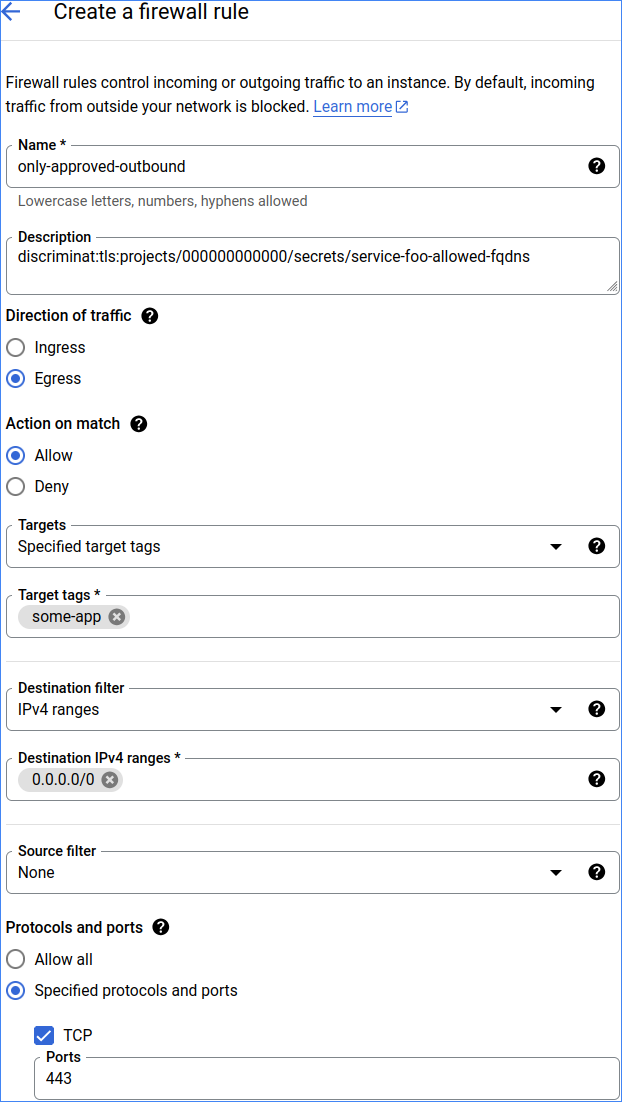 9092. Destination filtermust be set toIP rangeand the range set to the narrowest you can think of. Now if you don't have anything narrower than0.0.0.0/0that is absolutely fine! The firewall takes care of validating the destination IP address of actual packets in many ways, but the Firewall Rule at the Google Cloud networking and security level must allow the packet to leave the virtual machine at all.0.0.0.0/0is a safe choice with the DiscrimiNAT Firewall in the way.- Multiple Firewall Rules can be associated with the virtual machines with the use of Network Tags, and they will all be recognised.