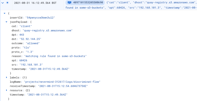 Flow Logs can be found in Logs Explorer under Logging, with the filter logName="projects/<google-cloud project name>/logs/discriminat-flow". A typical flow log looks like: