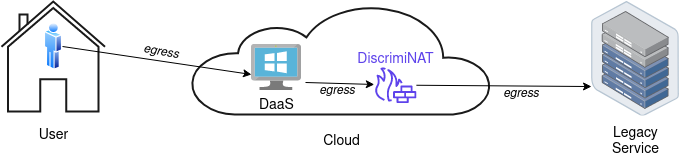 But first, let's consider a hypothetical setup that involves a Desktop as a Service (DaaS¹) VM in the Cloud, its egress routing filtered by DiscrimiNAT and a legacy service running on an on-premise server. A user working from home logs on to the Cloud desktop and, amongst other tasks, also needs to connect to the legacy service running on-premise.
